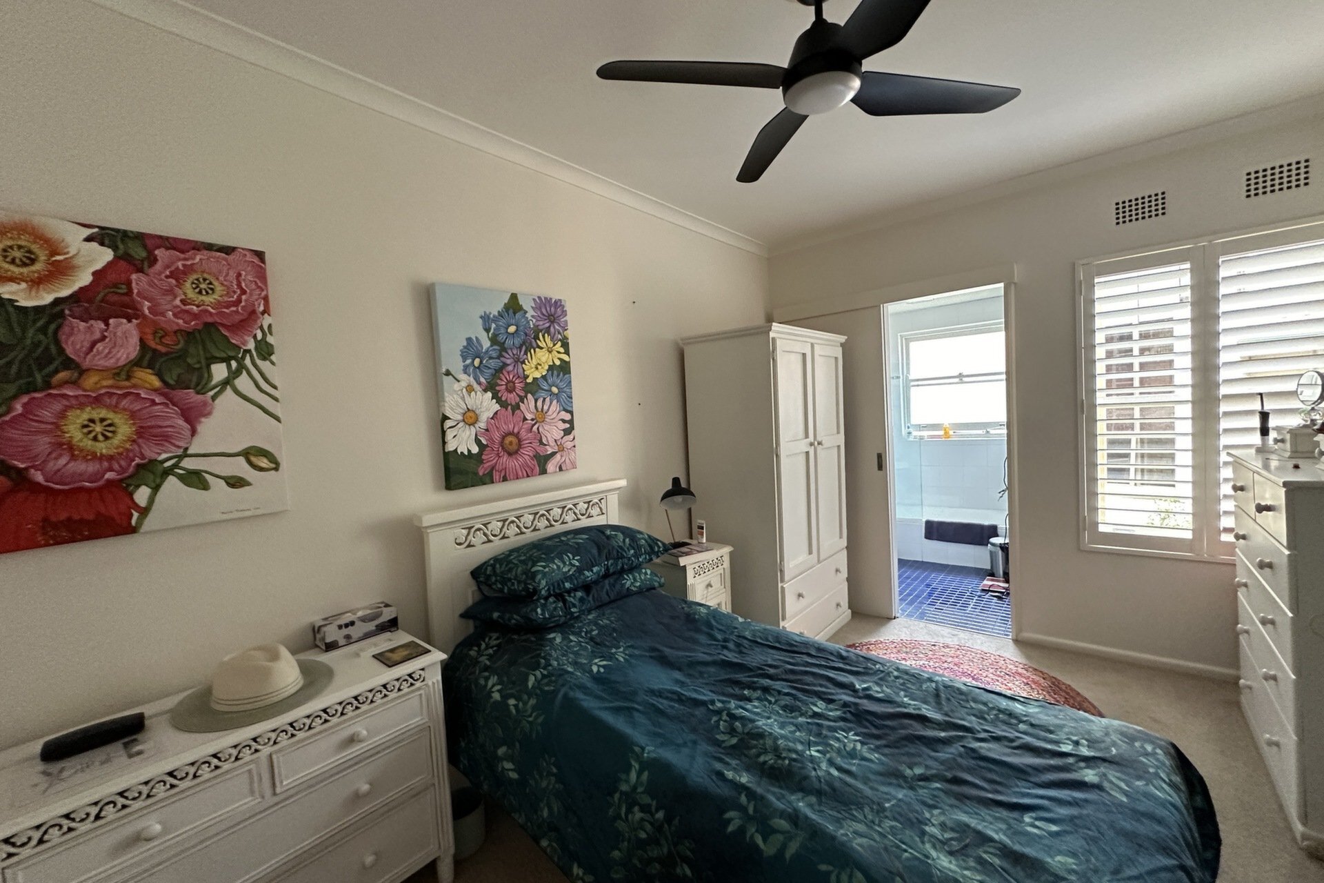 Ensuite bathroom with bath and shower leading from the large bedroom complete with built-in wardrobe and ceiling fan.