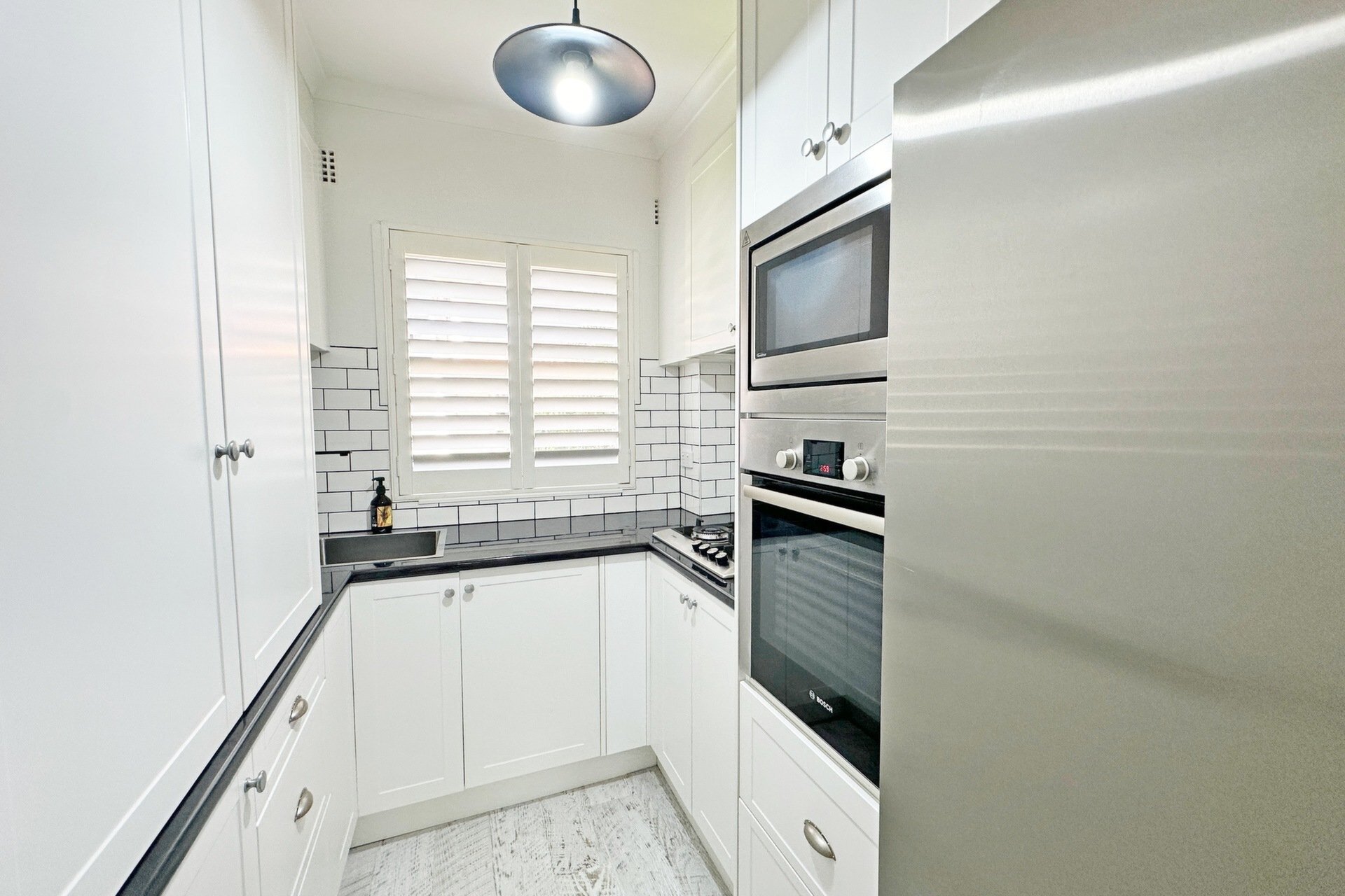 Fitted with a modern kitchen complete with a fridge, oven, microwave, and gas cooktop.